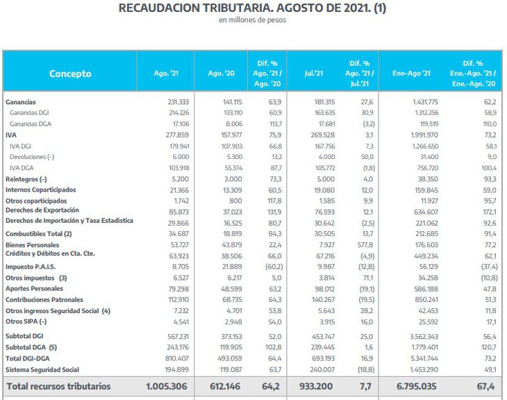 La recaudación tributaria registró un crecimiento de 64,2% interanual en agosto a $1.005.306 millones, una suba por encima del aumento de los precios del período, informó este miércoles la Administración Federal de Ingresos Públicos (AFIP). De esta manera, se ubica en lo que va del año en niveles pre-pandemia.