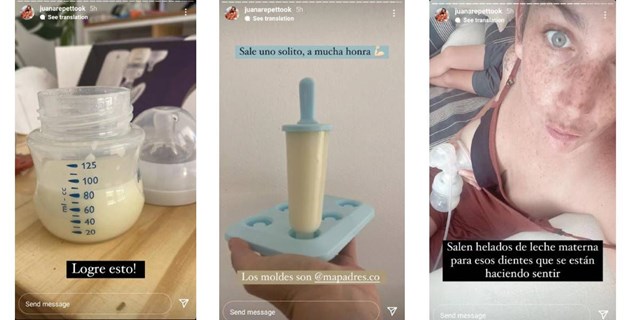 En una serie de historias, la actriz compartió el proceso para hacer helado de leche materna. En una de las postales, se la puede ver sacando leche, luego la mamadera y finalmente el helado realizado en un molde tradicional.