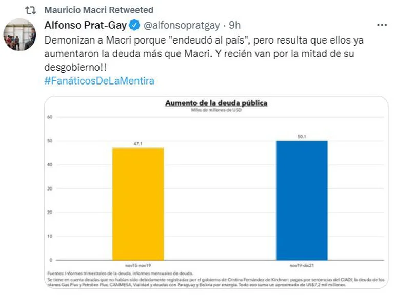 “Demonizan a Macri porque ‘endeudó al país’, pero resulta que ellos ya aumentaron la deuda más que Macri. Y recién van por la mitad de su desgobierno!! #FanáticosDeLaMentira”, fue el segundo tuit de Prat-Gay que compartió el ex mandatario.