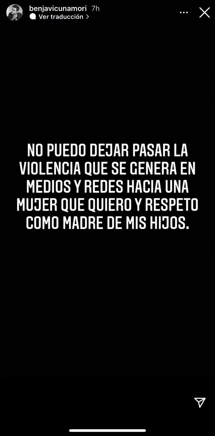 En medio de este escándalo, el actor le dio su respaldo a la madre de sus dos hijos menores través de las redes sociales para poner un manto de piedad. “No puedo dejar pasar la violencia que se genera en medios y redes hacia una mujer que quiero y respeto como madre de mis hijos”, escribió en un historia de su cuenta oficial de Instagram.