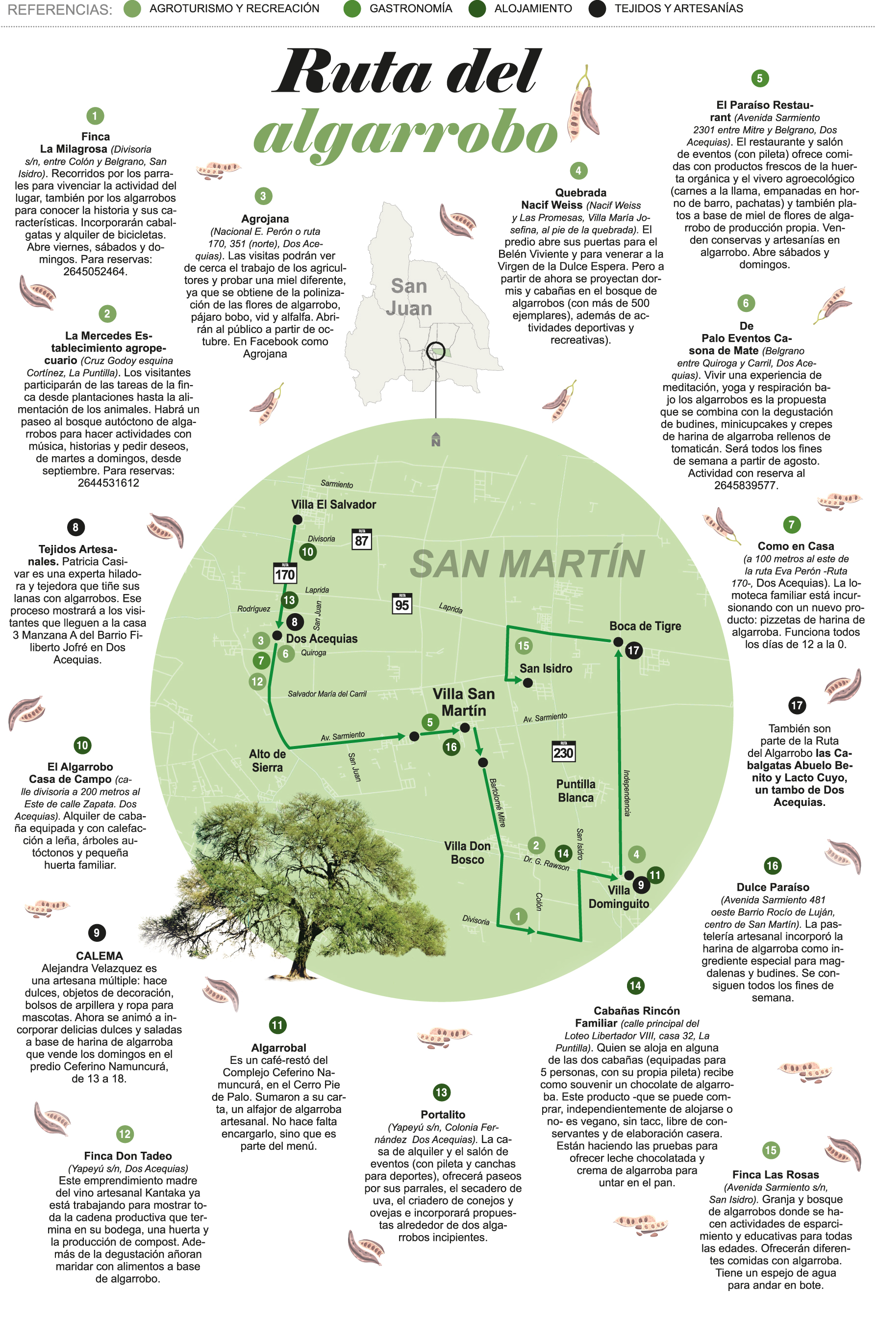 Con sus emprendimientos no tienen modo de formar parte de la Ruta del Vino ni de la del Aceite de Oliva. No es lo que ofrecen. Ni lo que tienen sembrado en sus tierras. Entonces buscando un elemento común que les diera identidad y les permitiera unificarse bajo un mismo lema o leitmotiv, encontraron que el algarrobo o su fruto estaba presente -de alguna manera- en sus negocios. Ya sea porque es el árbol emblema que se mantiene en pie desde hace años en sus surcos, porque es la madera predominante en el lugar, porque es el ingrediente principal en algunas de las comidas que se ofrecen en sus cartas. Eso fue suficiente para "asociarse" a una misma idea, comenzar a planificar y delinear propuestas interesantes para los visitantes. También, si así puede decirse, el paraguas bajo el cual se cobijaron los privados para ampararse bajo un nuevo circuito, como puntapié inicial partiendo desde San Martín pero pudiendo abarcar a todo operador turístico, gastronómico y recreativo a lo largo y ancho de la provincia. La iniciativa fue bien recibida en el Ministerio de Turismo que puso a disposición toda su capacidad operativa y de conocimientos, además del compromiso de difusión. También fue aplaudida en el municipio que ya empezó a ocuparse por hacer señalización acorde con la propuesta.