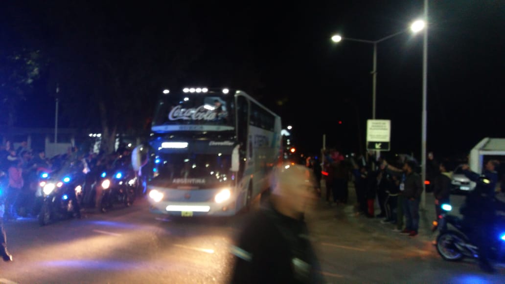 La Selección Argentina arribó al Aeropuerto Domingo Faustino Sarmiento alrededor de las 20:30 de este jueves, casi una hora y media después de lo previsto.