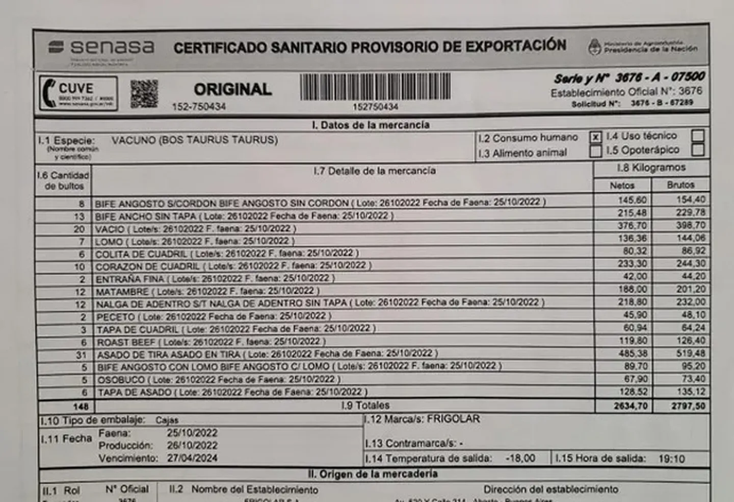 TN tuvo acceso al certificado del Senasa, que autorizó a la Selección a llevar los 2630 kilos de carne.
