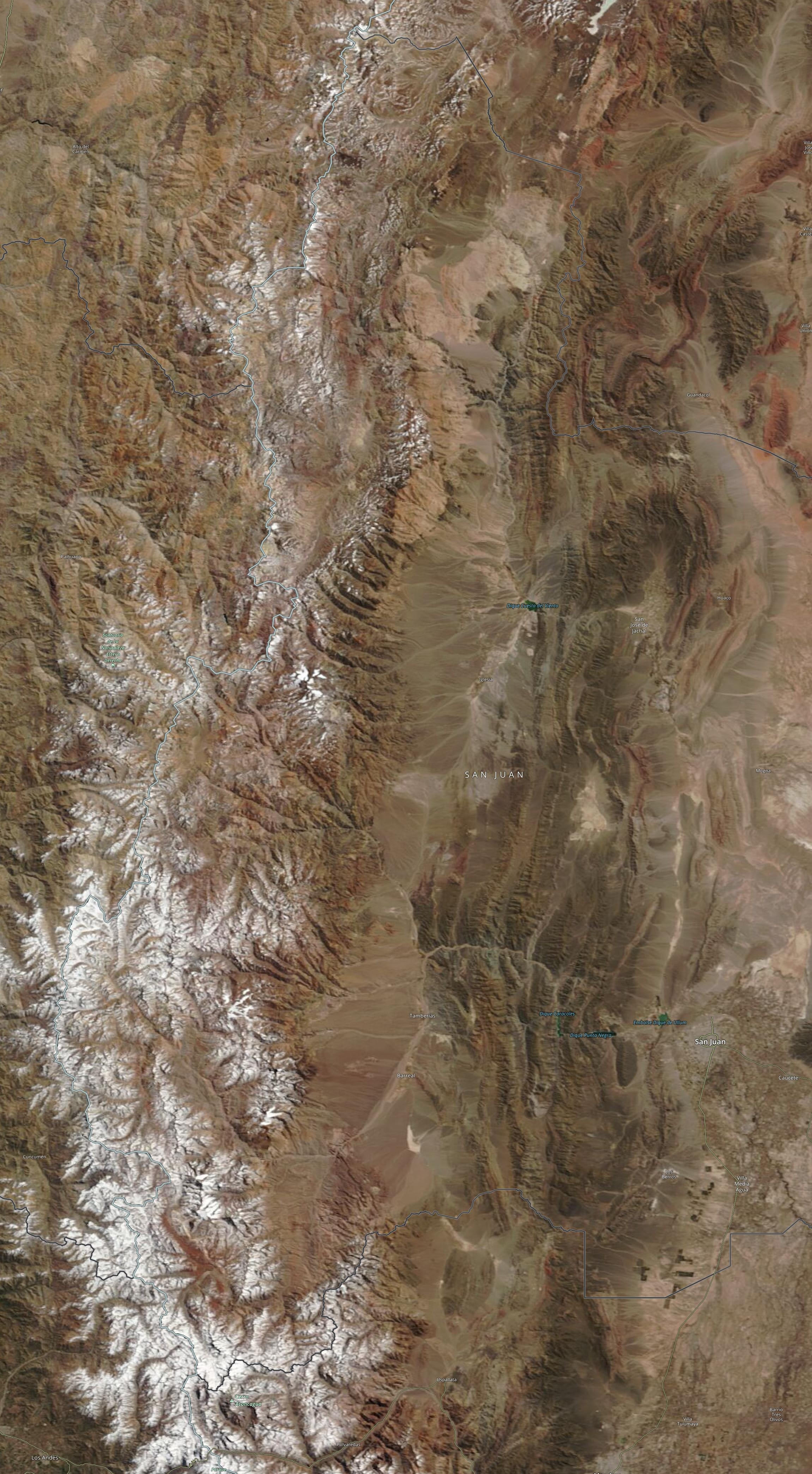 "Los valores de caudales y derrames anuales medidos en el río San Juan tienen su correlación directa con la precipitación de nieve en la cordillera, como ejemplo se muestran las imágenes satelitales -ver imágenes-, descargadas del Servicio Worldview de la NASA y capturadas en el mes de septiembre de los años 2015 al 2020, con la indicación del correspondiente derrame anual en el Sistema Hídrico del río San Juan (SHRSJ)", explica.