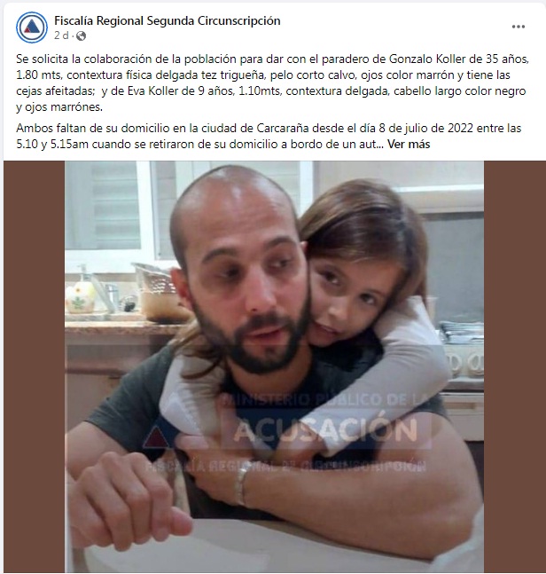 En tanto, el Ministerio Público de la Acusación de Santa Fe publicó la búsqueda de la niña en las redes sociales. “Se solicita la colaboración de la población para dar con el paradero de Gonzalo Koller, de 35 años; 1,80 metros; contextura física delgada; tez trigueña; pelo corto, calvo; ojos color marrón. Tiene las cejas afeitadas. Y de Eva Koller, de 9 años; 1,10 metros; contextura delgada; cabello largo, color negro; y ojos marrones”, describieron, junto a la foto de los dos.