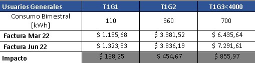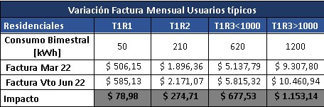 Para un caso intermedio de variación de tarifa planteado (13,59%), el impacto en la factura de usuarios típicos es el que se muestra a continuación: