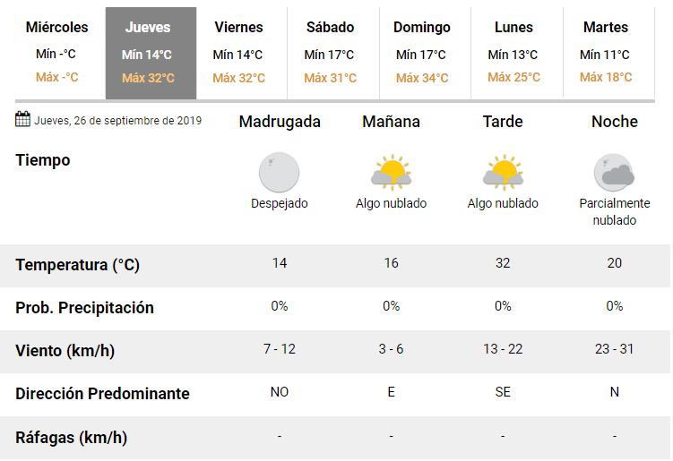 La jornada se presentará con cielo algo nublado y vientos de direcciones variables.