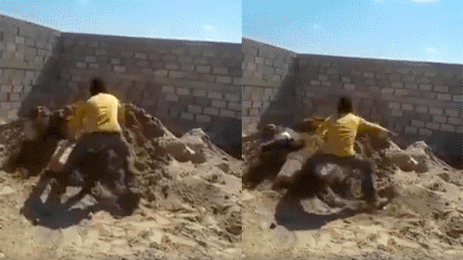 El hombre que estaba trabajando como todos los días, fue asustado por uno de sus compañeros en el momento en el que se acercó a una montaña de arena. Previo a pegarse un tremendo susto, el empleado se encontraba con un balde en una de sus manos el cual pretendía llenarlo de material.