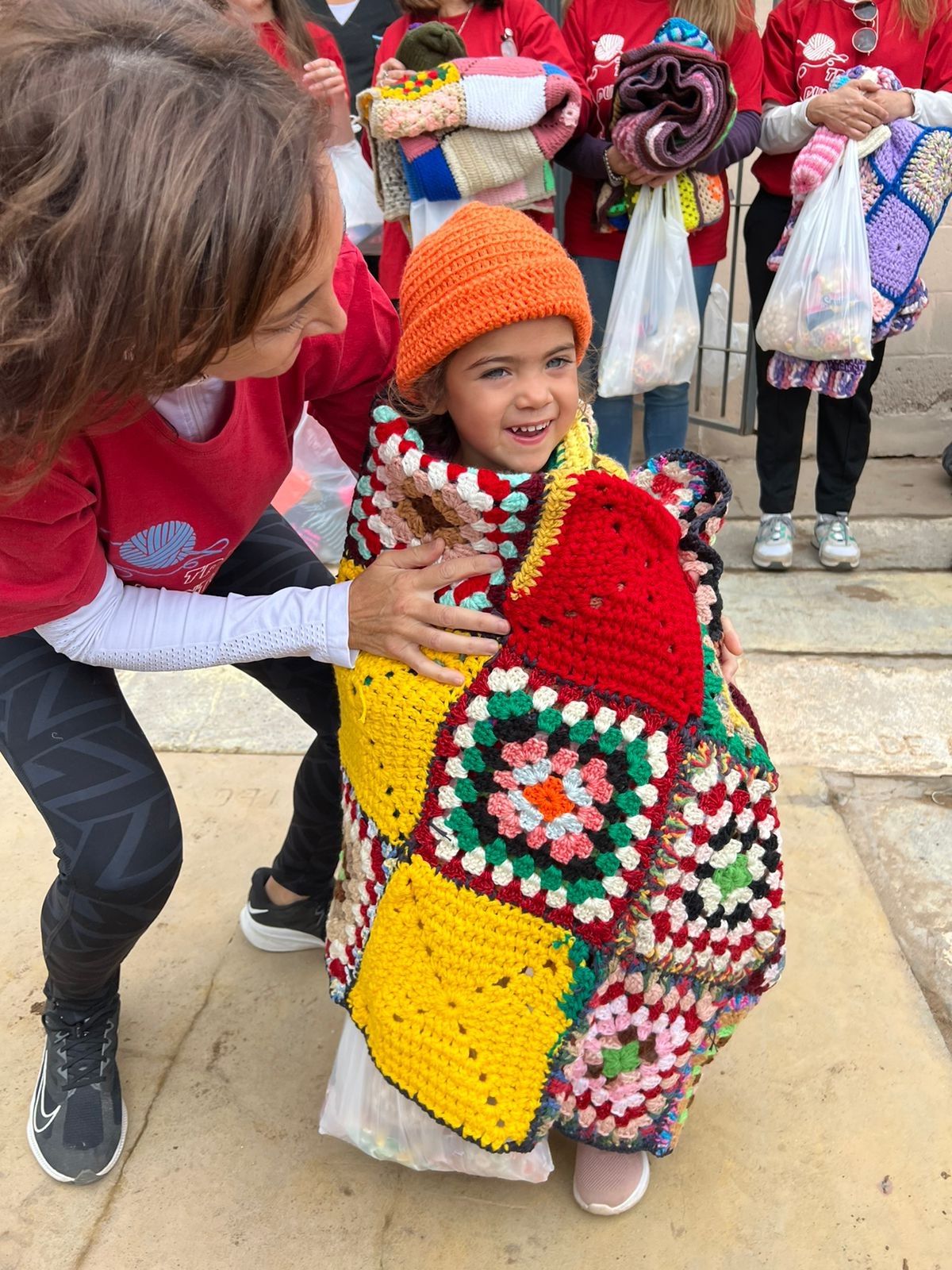 El grupo de más de 20 mujeres integrantes de "Travesía Punto x Punto" -todas alumnas de las clases de dos agujas y crochet, entre otras técnicas, que dicta Carina Iribarren- comenzó en 2014 a desplegar una tarea solidaria que implica armar mantas con cuadraditos tejidos. Necesitan alrededor de 40 de estas formas para armar una especie de frazadita que entregan a cada uno de los niños beneficiados. Con el correr de los años, además agregaron prendas tejidas como gorros, medias y hasta ponchitos que hacen con sus propias manos.