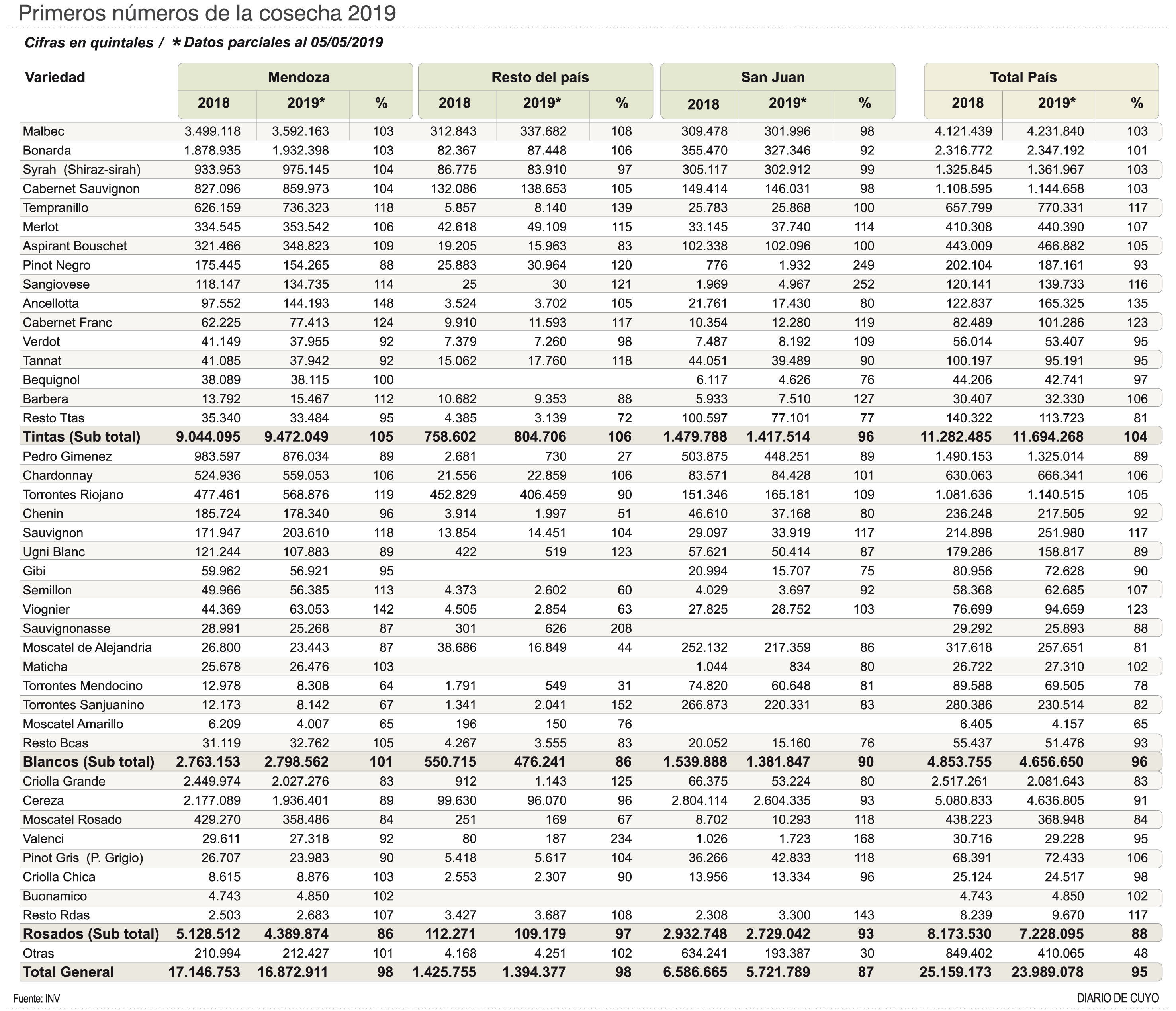 A nivel nacional, y también en la provincia, la uva tinta emblema, Malbec, creció un 3 % trepando ya a los 423 millones de kilos, un nuevo récord del varietal ícono de la Argentina. La Bonarda y Syrah tuvieron un leve incremento del 1 %. El tradicional Cabernet Sauvignon creció también un 3% a nivel país. En estas tres variedades, San Juan tuvo una merma del 2 %.