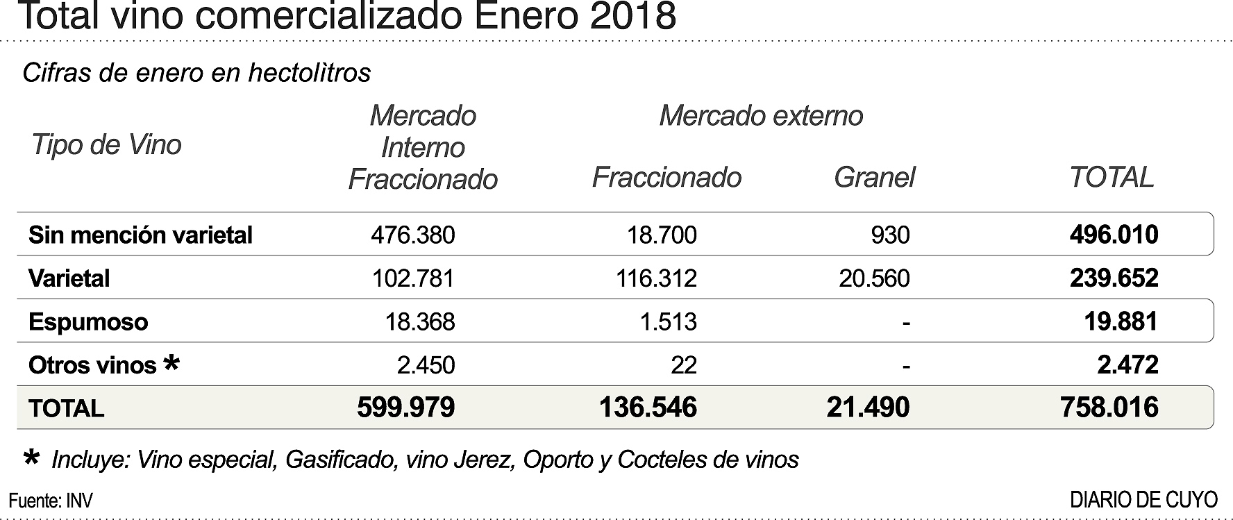 Donde sigue la baja es en el mercado externo que dejó para enero una caída del 6,8% para igual mes del 2017. El informe del INV también revela que la importación de vinos para el primer mes del año fue de 1.112.300 litros. Respecto del mosto (jugo concentrado de uva) la suba fue del 23,1% exportándose 5.523 toneladas.