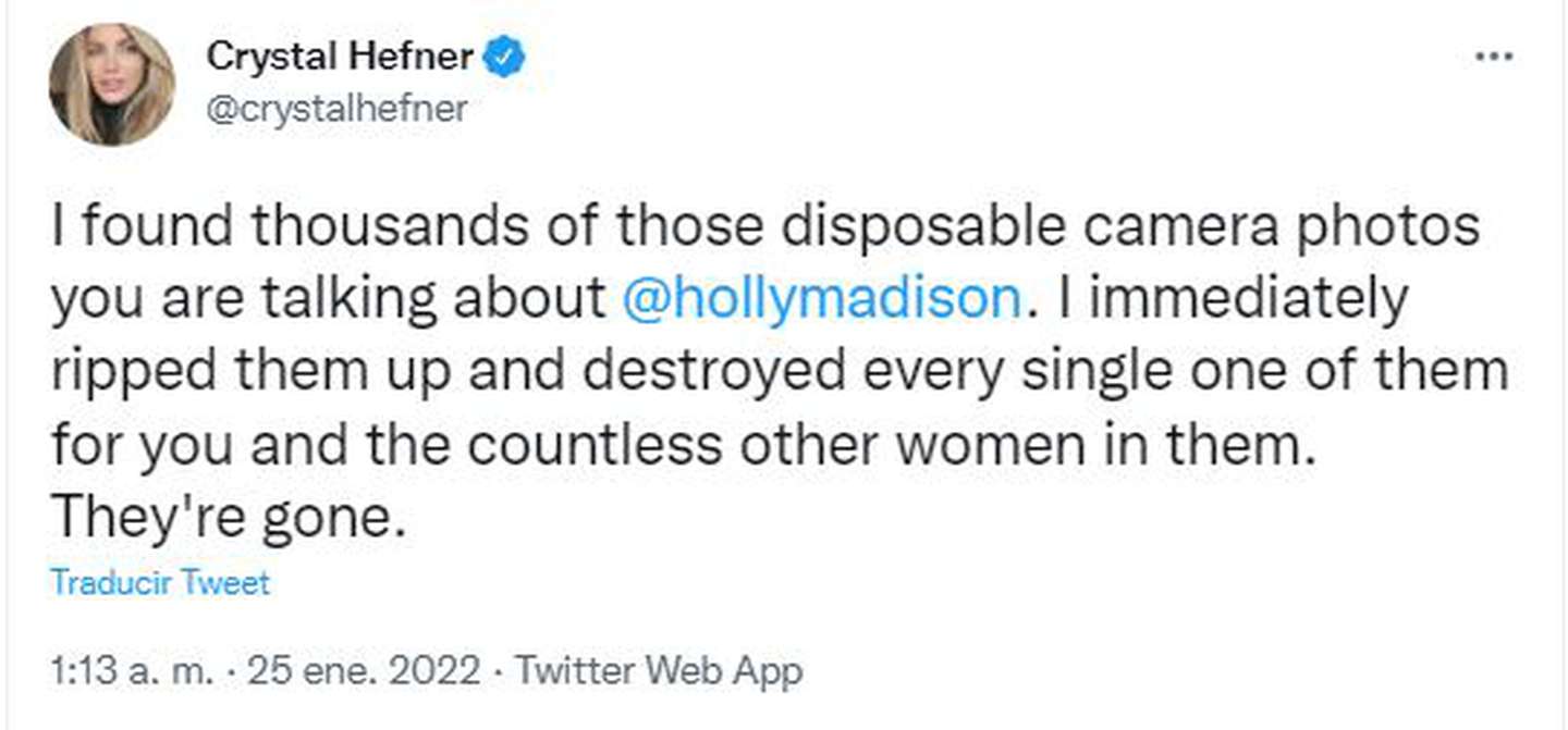 Crystal Hefner se expresó en Twitter luego de que Holly Madison, una de las novias del magnate de Playboy, dijera que temía ser víctima de una pornovenganza, debido al material pornográfico privado del que fue parte y que durante muchos años retuvo Hefner.