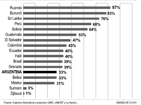 Los últimos datos revelados por la OMS ubican a la Argentina por debajo del promedio mundial en lactancia (Ver infografía). Uno de cada tres bebés recibe leche materna de manera exclusiva en los primeros meses de vida, por lo que son muchos los que se quedan sin esa posibilidad, ya sea por ignorancia de sus madres o por no crearles las condiciones apropiadas para amamantar a sus hijos.