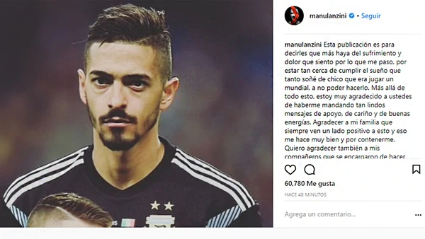 "Esta publicación es para decirles que más haya (sic) del sufrimiento y dolor que siento por lo que me pasó, por estar tan cerca de cumplir el sueño que tanto soñé de chico que era jugar un mundial, a no poder hacerlo. Más allá de todo esto, estoy muy agradecido a ustedes de haberme mandando tan lindos mensajes de apoyo, de cariño y de buenas energías. Agradecer a mi familia que siempre ven un lado positivo a esto y eso me hace muy bien y por contenerme", escribió Lanzini.