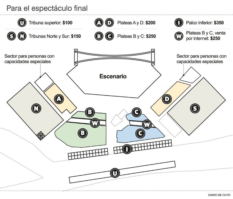 Los precios son: en la tribuna superior, 100 pesos, en las tribunas Norte y Sur, 150 pesos. En Platea A y D, 200 pesos, mientras que en la Platea B y C cuesta 250 pesos. Y en el Palco Inferior, el costo de la entrada es de unos 350 pesos.