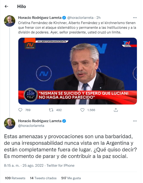 “Cristina Fernández de Kirchner, Alberto Fernández y el kirchnerismo tienen que frenar con el ataque sistemático y permanente a las instituciones y a la división de poderes. Ayer, señor presidente, usted cruzó un limite. Estas amenazas y provocaciones son una barbaridad, de una irresponsabilidad nunca vista en la Argentina y están completamente fuera de lugar", planteó el dirigente de Juntos por el Cambio a través de dos posteos en redes sociales.