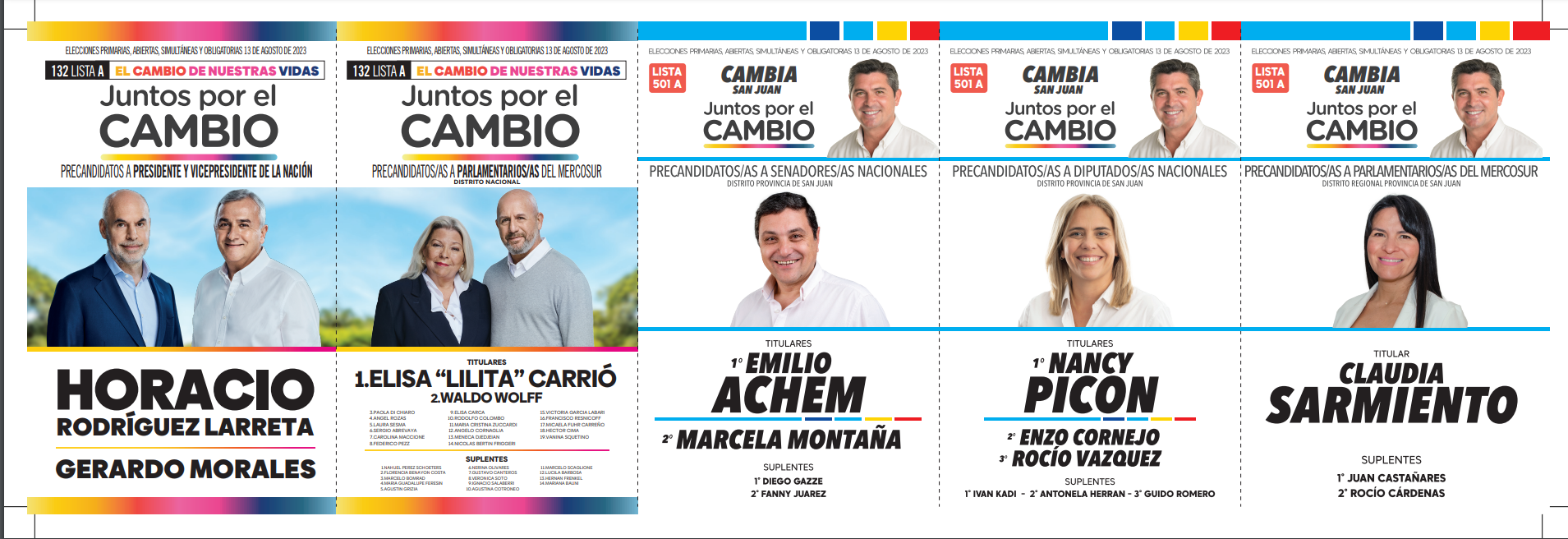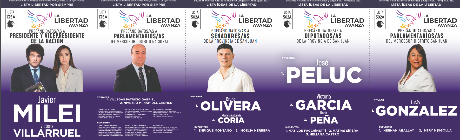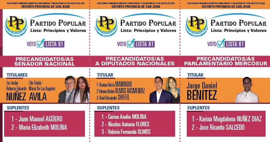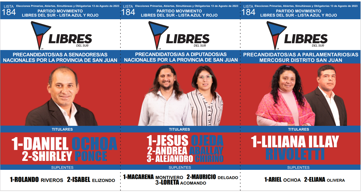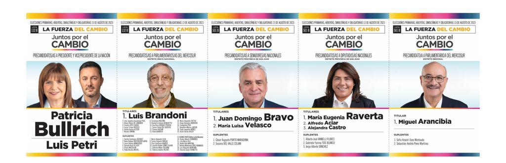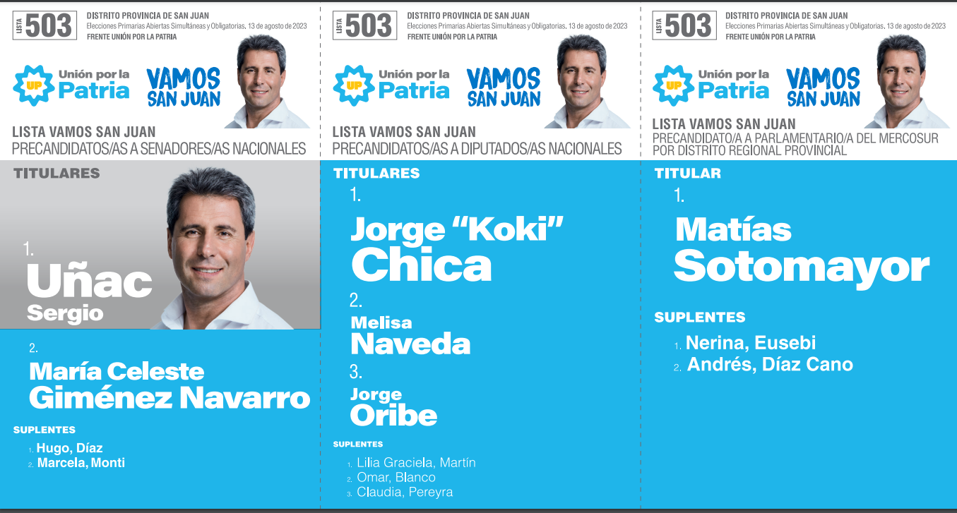 En San Juan, cuatro son las coaliciones que competirán en las PASO y solo en tres habrá internas. En Unión por la Patria (las dos boletas tienen a Massa como precandidato a presidente), Juntos por el Cambio (una tiene a Larreta y la otra a Bullrich) y el Frente de Izquierda y de Trabajadores – Unidad se presentaron dos listas (una tiene a Bregman y la otra a Solano), mientras que La Libertad Avanza tuvo un sólo armado (llevan a Milei como precandidato a presidente). Además, habrá cuatro partidos que jugarán en soledad: la Cruzada Renovadora (no lleva precandidato a presidente), Movimiento Libres del Sur (no lleva precandidato a presidente), el Socialismo (lleva a Schiaretti) y el Partido Popular (no lleva precandiato a presidente).