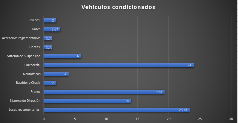 En segundo lugar, muy cerca con el 23,33%, de las causas por las que la aprobación es condicional se debe a que en el vehículo no funcionan correctamente todas las luces reglamentarias. En tanto, el sistema de frenaje, con el 19% completa este podio.