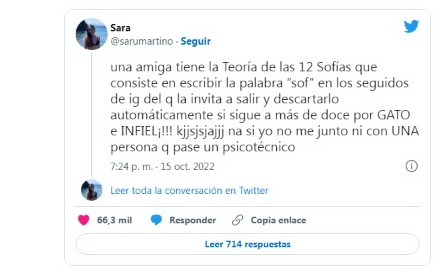 Al poco tiempo, el tuit se hizo viral y miles de usuarios comenzaron a aplicar la teoría. ¿Cómo hicieron? Buscaron “sof” en los perfiles de instagram de sus parejas u otros hombres, y contaron la cantidad de usuarios que le aparecían en el apartado “seguidos”.