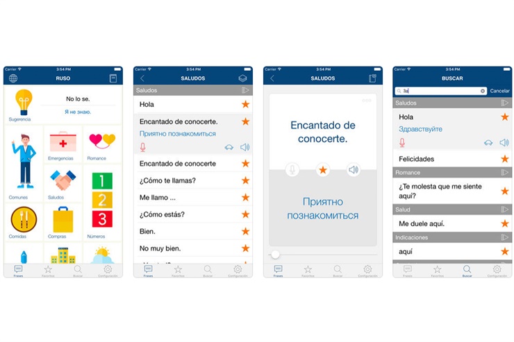 La app Aprende Ruso tiene grupos de frases agrupadas por las más comunes, emergencias, comidas, compras, números y para romance. Las muestra en español con la transliteración para poder leerla y cómo se escribe en cirílico. Tiene audio para escuchar la pronunciación a velocidad normal y "caracol", para poder captarla más fácilmente. Se puede establecer voz femenina o masculina y se pueden agrupar por frases favoritas.