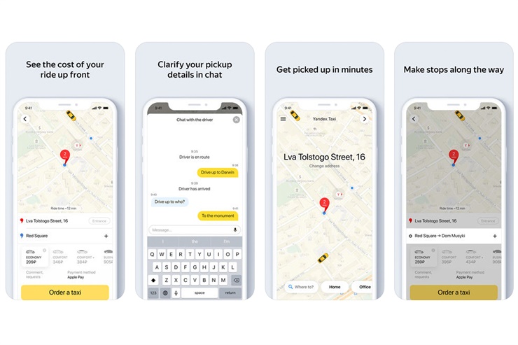 Yandex Taxi permite pedir un taxi compartiendo la dirección o ubicación al conductor. Ofrece tres tipos de tarifas: económica, confort y business.