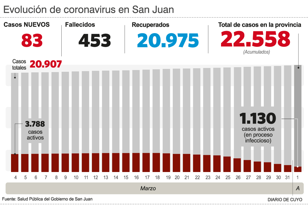 Después del feriado de Viernes Santo sin difusión de datos oficiales, en la infografía (arriba) se detalla los últimos datos actualizados, del jueves pasado, con respecto a la situación epidemiológica en San Juan. Además, se recuerda que hoy retomarán hisopados y vacunación Covid.