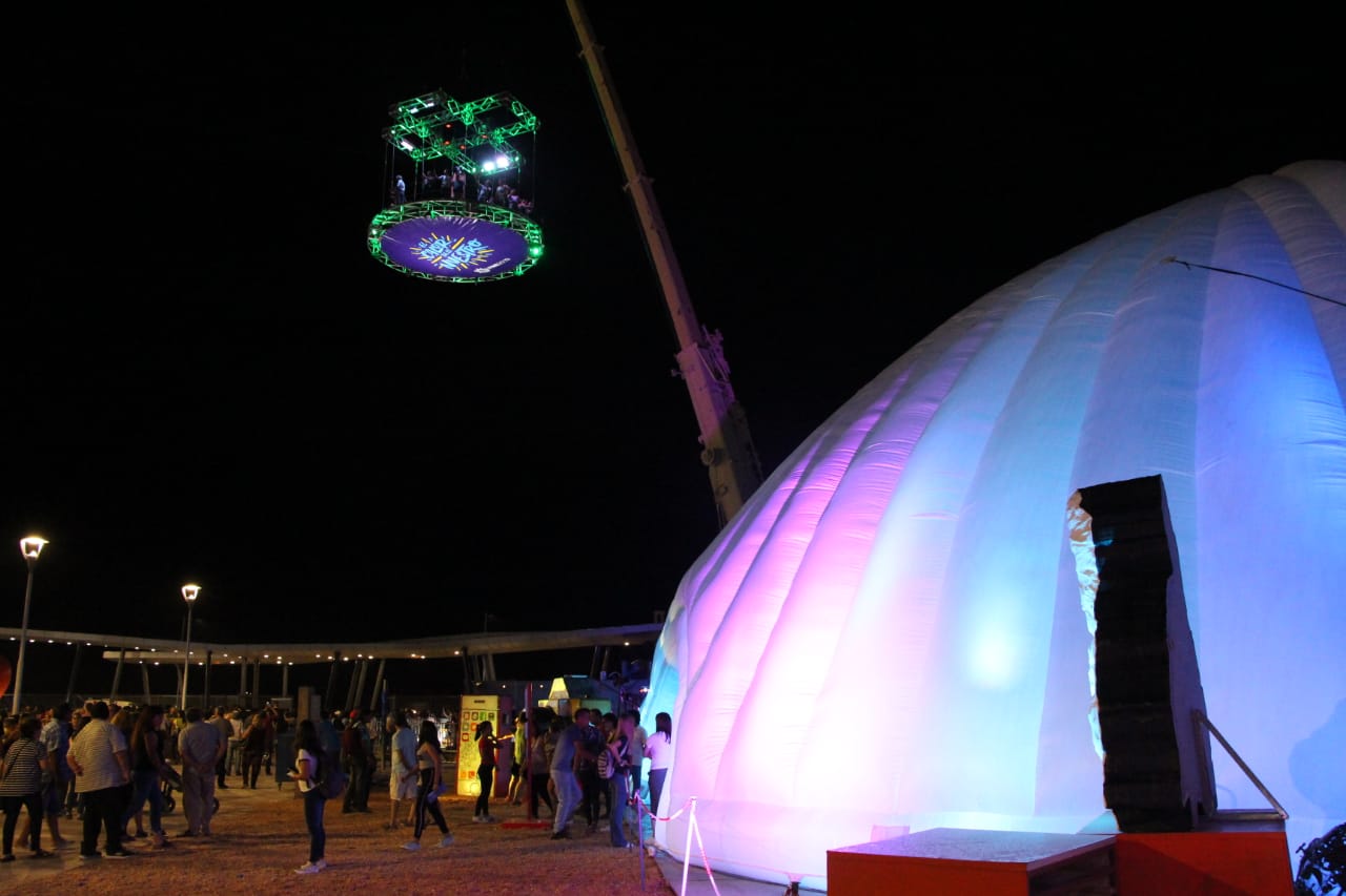Subieron a una grúa que levanta una plataforma circular a 20 metros del suelo y gira sobre su eje para que los participantes adquieran una visión 360° del predio. Es ideal para sacar fotos y aumentar un poco la adrenalina. Todas las candidatas, quisieron vivir esta experiencia, salvo las postulantes de Jáchal, Rawson y Sarmiento, quienes no se animaron por tener miedo a las alturas.