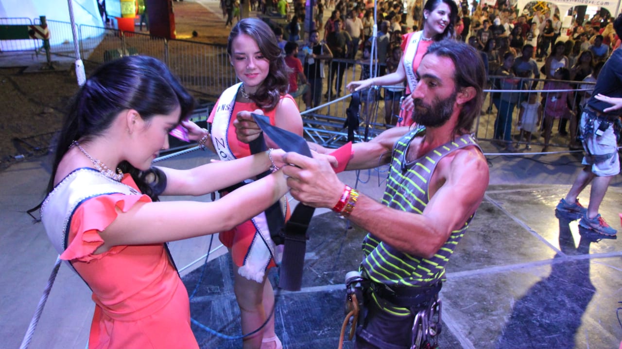 Una a una, las aspirantes a ocupar la corona del Sol fueron subiendo a la plataforma cuidadosamente y se colocaron los arneses de seguridad. Sonrieron, posaron y se divirtieron en la altura.