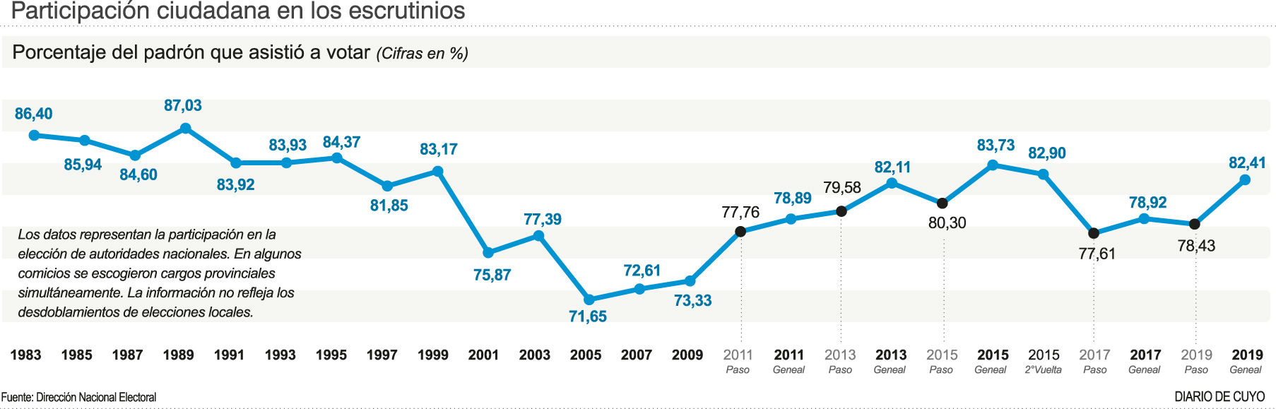 Una de las particularidades de las PASO 2021 en San Juan es que se convirtieron en las elecciones con menor participación ciudadana desde que regresó la democracia nuestro país en 1983. Según datos preliminares, se presentó a votar el 61% de los ciudadanos empadronados. Y en las 25 ocasiones anteriores, el registro más bajo ocurrió en las legislativas de 2005, con 71,65% de votantes habilitados.