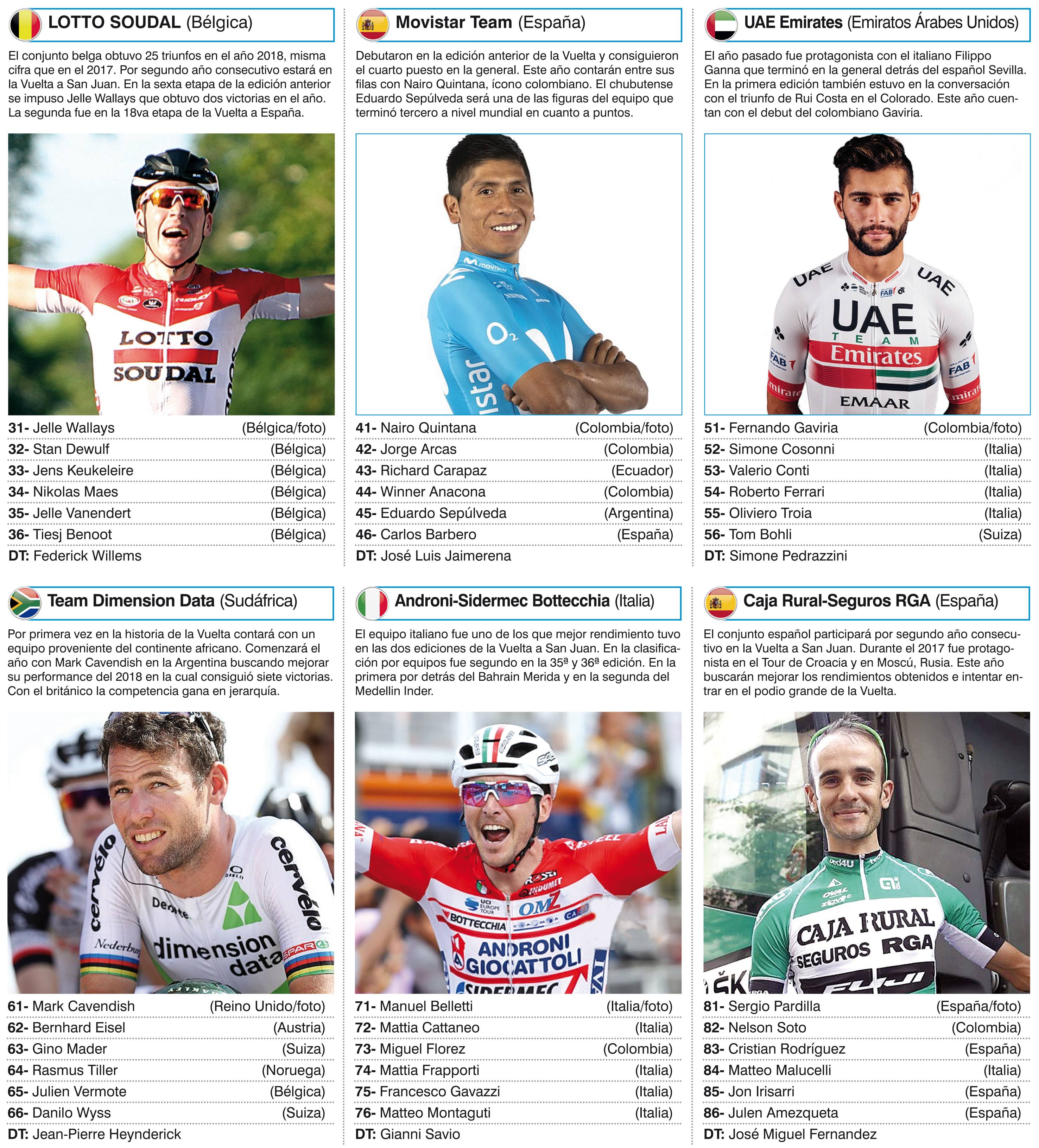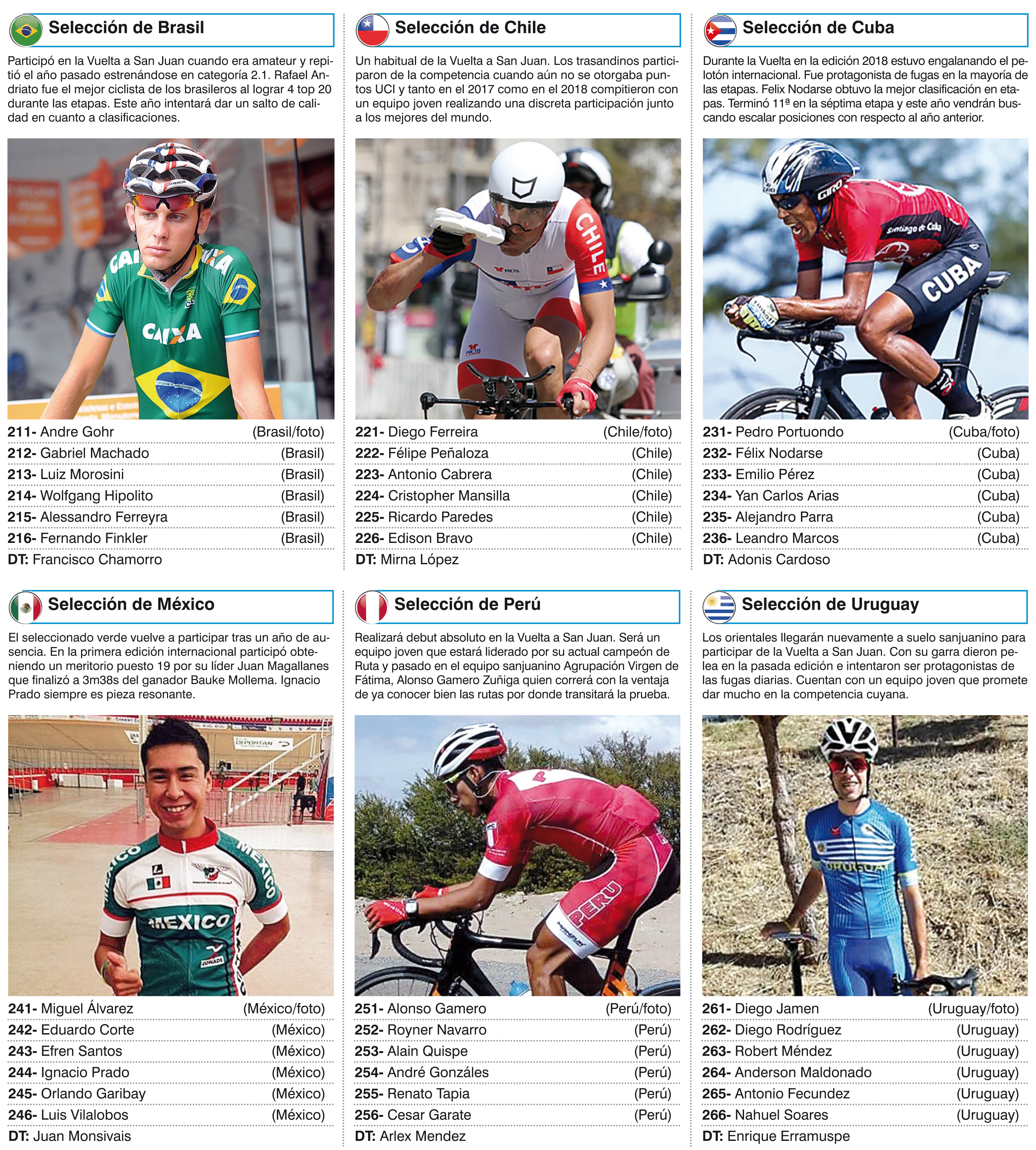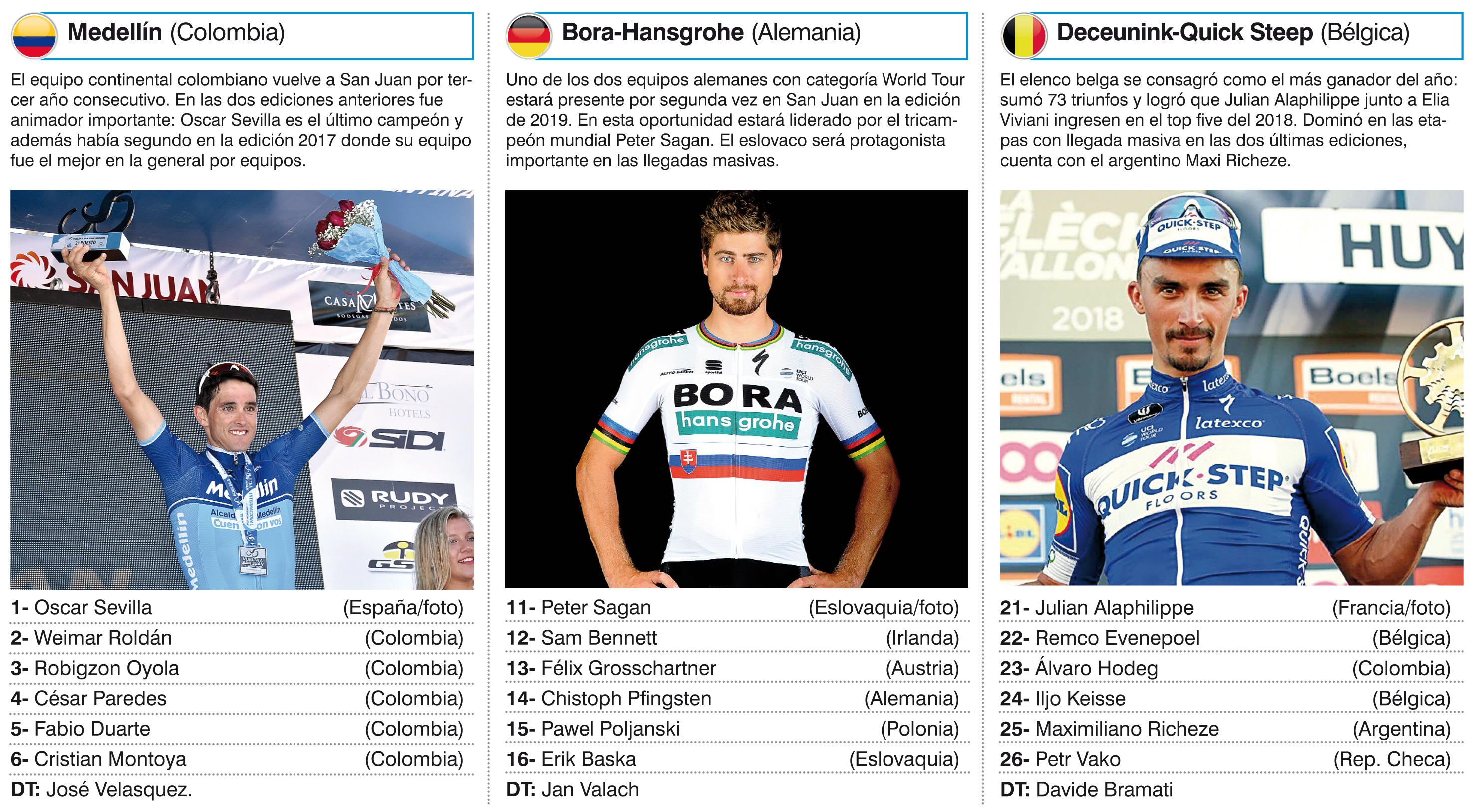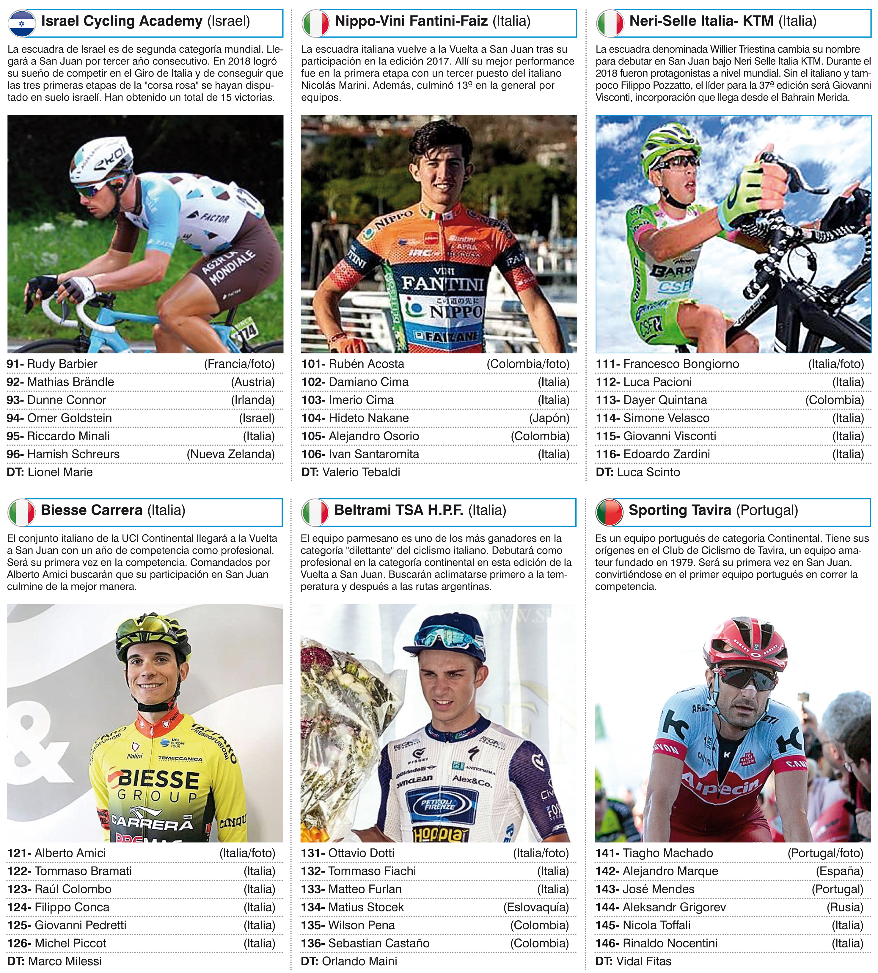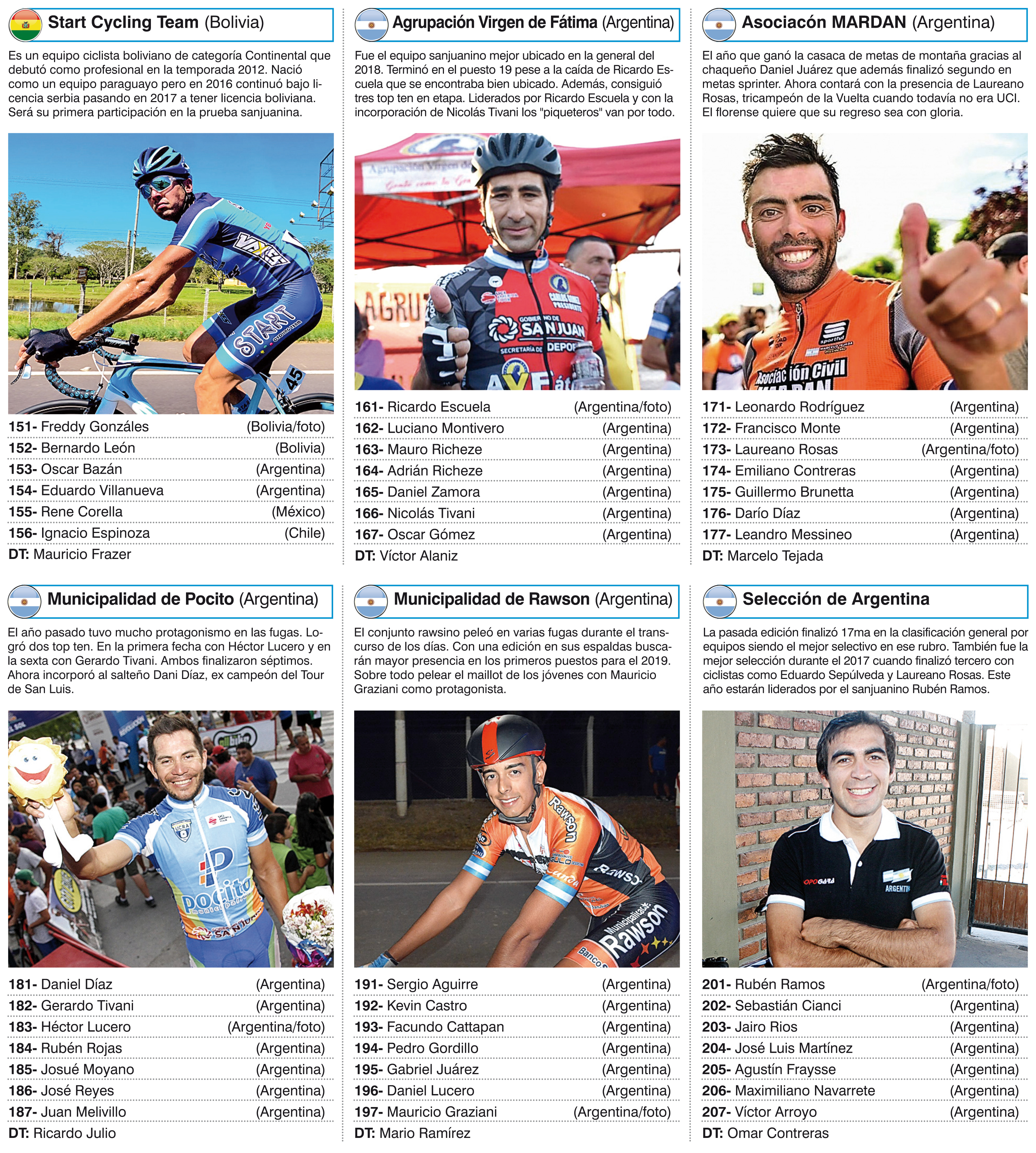 Se espera que sea la Vuelta a San Juan de mayor nivel respecto a su pelotón. Serán 27 los equipos que formarán parte de la prueba y habrá de todas las nacionalidades. Según el rango que ostentan para la Unión Ciclista Internacional serán nueve los equipos Continentales entre los que se encuentran los cuatro sanjuaninos: Municipalidad de Pocito y Rawson, la Agrupación Virgen de Fátima y la Asociación Civil Mardan, además serán cinco los Profesionales Continentales, siete selecciones nacionales y seis equipos World Tour. Un pelotón de lujo, como nunca antes hubo en San Juan. El repaso por cada uno de ellos a continuación: