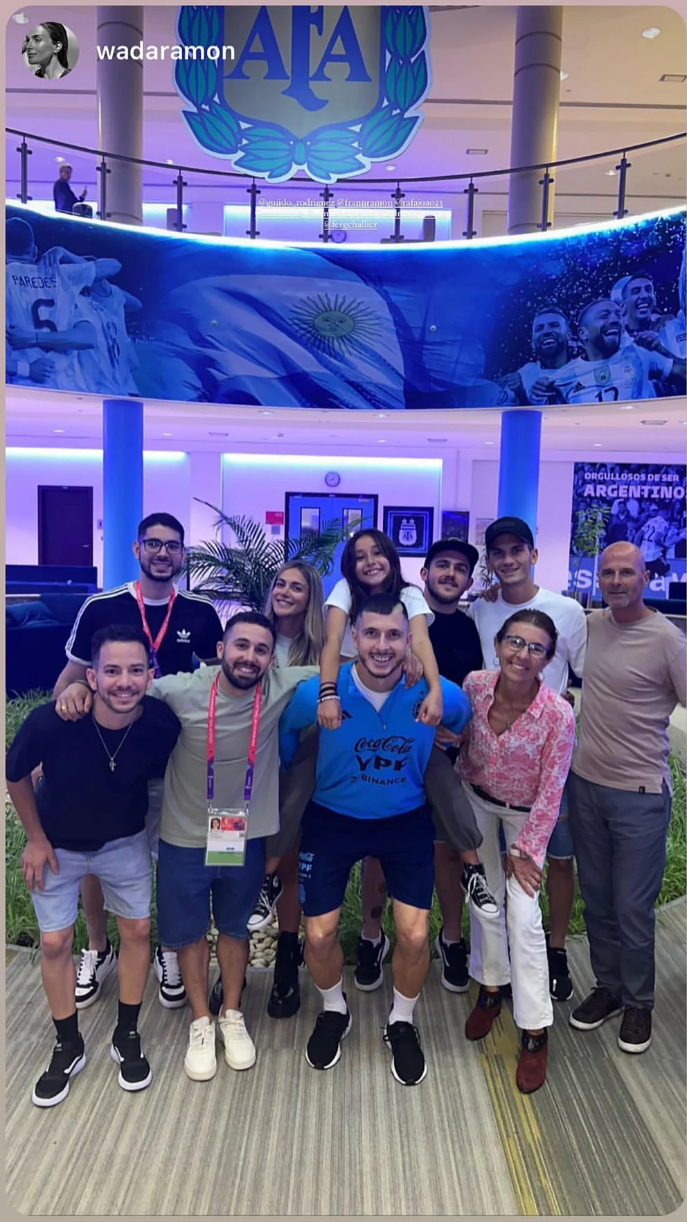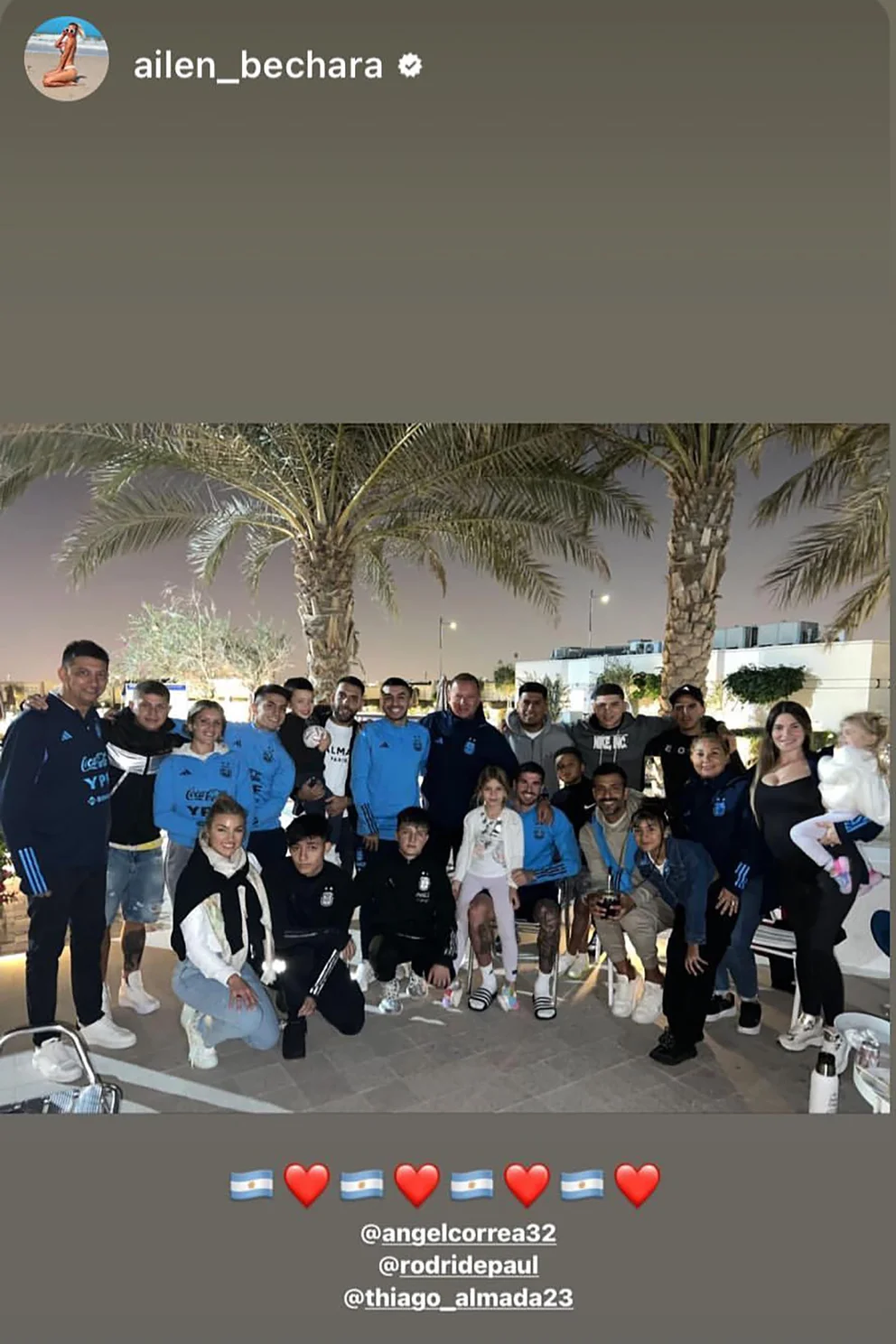 Los que compartieron un momento especial fueron Ángel Correa, Thiago Almada y Rodrigo De Paul. Familiares de los tres jugadores se jugaron en la zona de la piscina externa que tiene el complejo y posaron para una foto que incluyó a 22 personas. Faltó Tini Stoessel, que estuvo brindando unos recitales en España, y se espera su regreso a Qatar para el mano a mano ante los croatas.