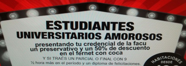 La última campaña emprendida por el motel apunta a seducir estudiantes universitarios, policías y empleados públicos para que visiten el lugar. Para los estudiantes la promoción propone 50% de descuento en un fernet con coca si presentan la credencial universitaria y media hora de regalo en el turno si llevan un parcial o final con una nota de 9 o superior.