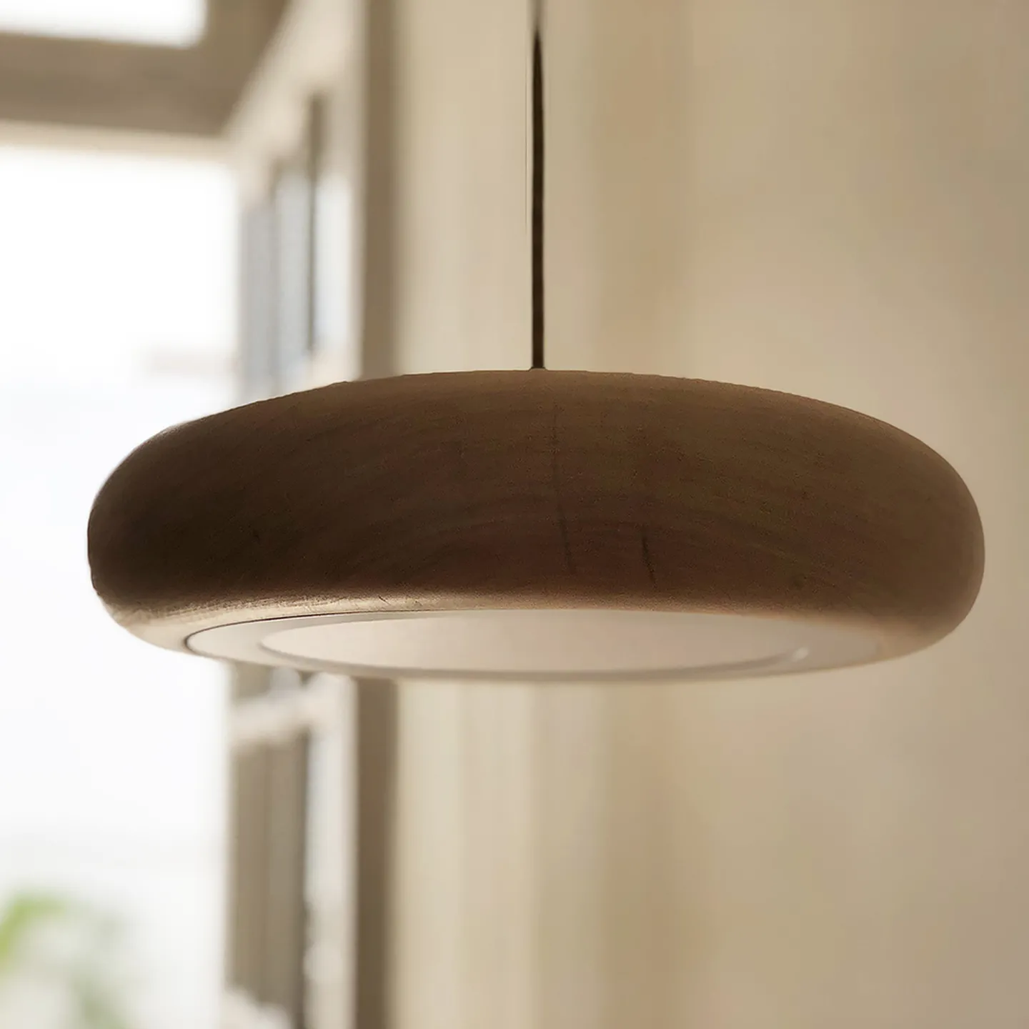 La línea Nutina, de Objetos Luminosos, tiene diseños de formas redondeadas y sin aristas. Cada pieza es única y está fabricada con madera de cedro de bosques sustentables argentinos.