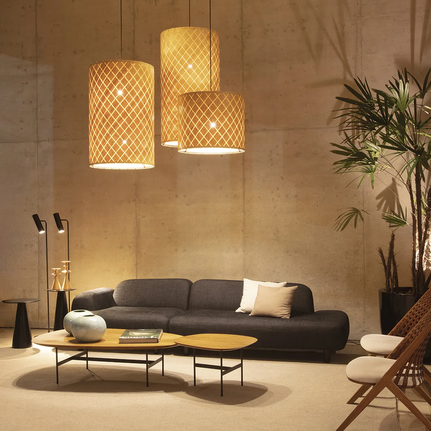 El set de lámparas Barquillo, de Patricia Lescano, es un conjunto de tres luminarias. Las pantallas están hechas con cintas de bambú trenzado y generan una luz matizada y cálida.