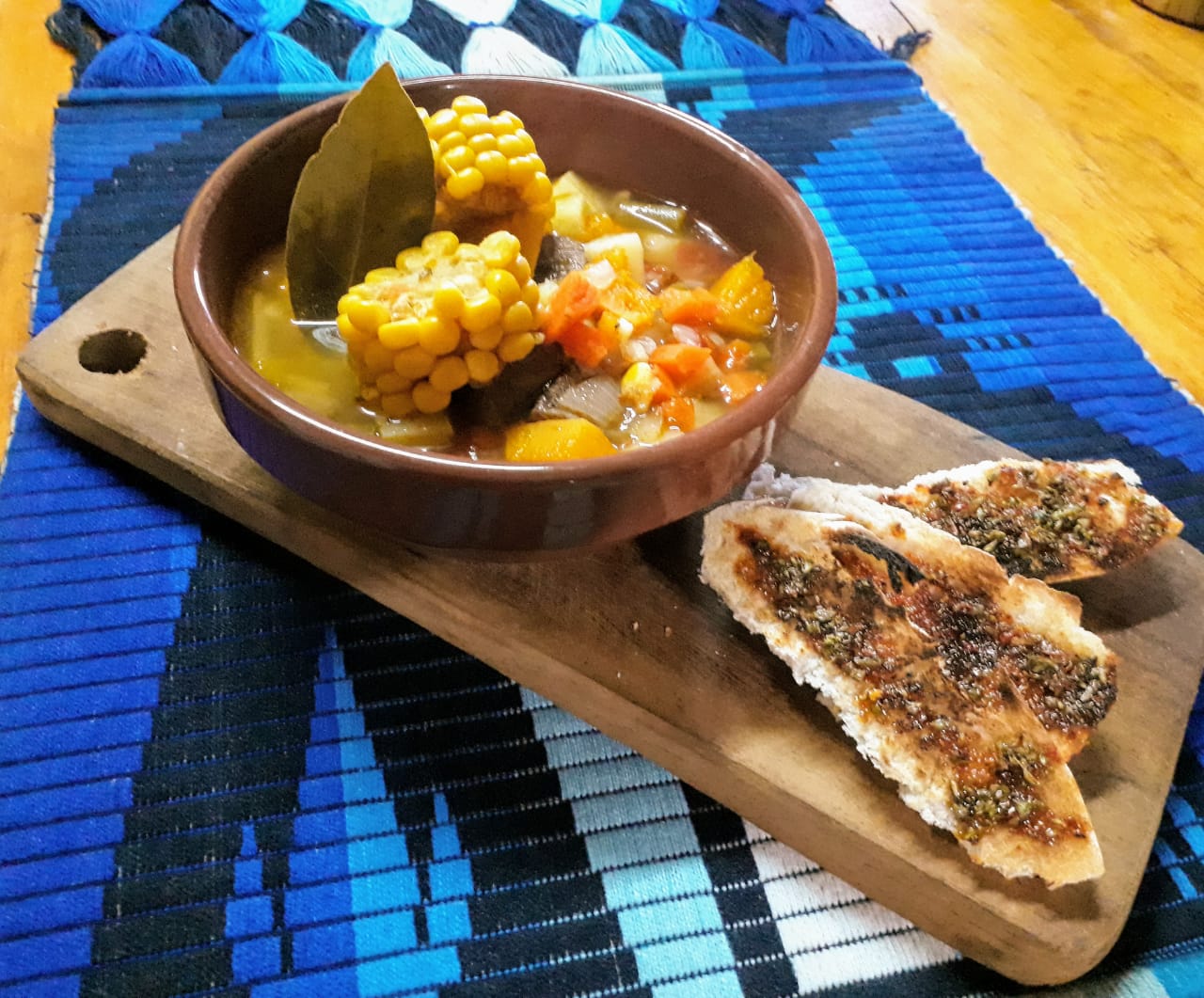 Preparación: En una cacerola verter el aceite y dorar la carne. Agregar las cebollas y dejar rehogar. Incorporar el resto de las verduras cortadas en cubitos. Añadir el laurel y sazonar con pimentón disuelto en agua, ají molido y orégano. Agregar el fondo líquido caliente. Dejar hervir destapado hasta que los ingredientes estén tiernos. Agregar el choclo y salpimentar. Dejar cocinar hasta que todo esté cocido.