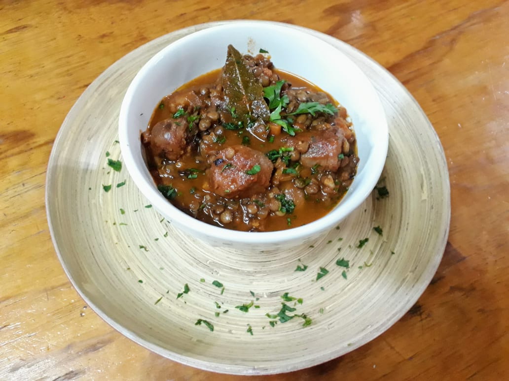 Preparación: Saltear rodajas de chorizo, agregar cebolla, ajo y zanahoria cortada en cubitos. Cocinar a fuego bajo. Incorporar las lentejas previamente remojadas por lo menos 2 horas previas. Agregar puré de tomate y tomate triturado. Aligerar con fondo de verduras, ya caliente. Agregar laurel, pizca de orégano, ají molido. Dejar cocinar. Rectificar sazón. Servir espolvoreado con perejil.