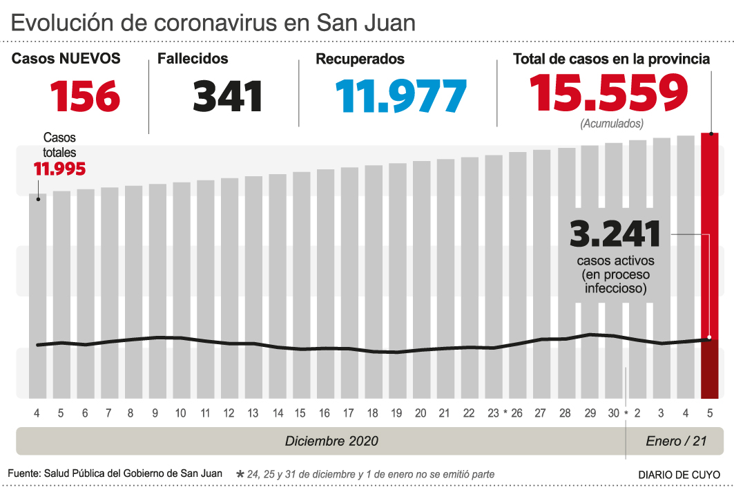Por otro lado, los nuevos positivos de coronavirus confirmados en el último parte de Salud Pública fueron 156, en tanto que los test que resultaron negativos fueron 246. Los contagios acumulados suman 15.559.