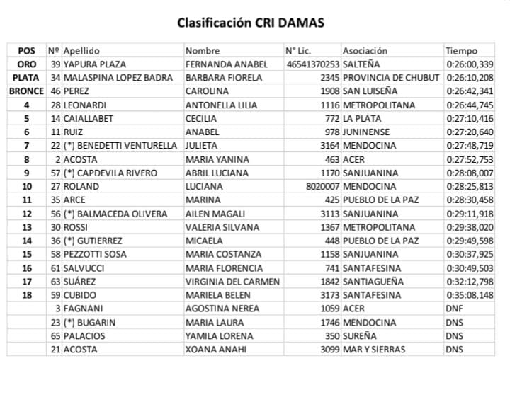 En damas Elite, la medalla de oro quedó en poder de la salteña Fernanda Yapura, mientras que la chubutense Fiorella Malaspina ganó la de plata y la puntana Carolina Pérez, la de bronce.