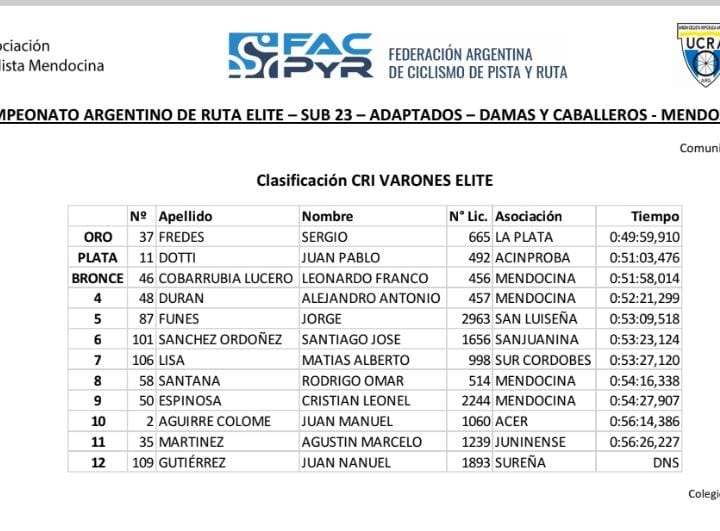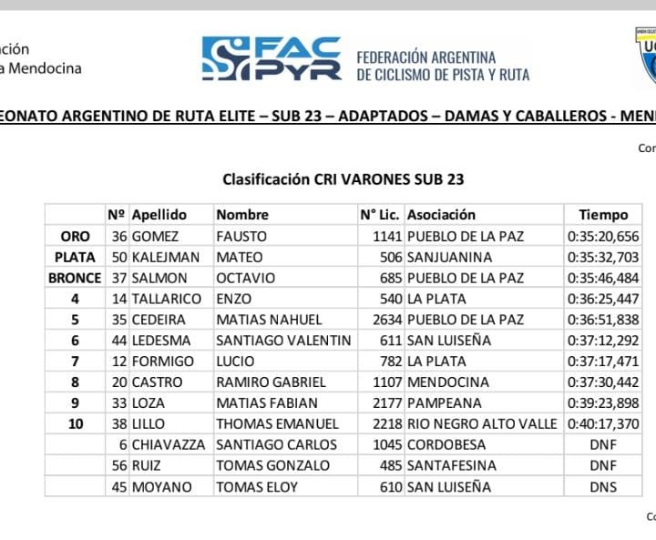Finalmente, la otra medalla para San juan fue en la Sub-23 masculina, con Mateo Kalejman ocupando el segundo puesto, detrás de Fausto Gómez y delante de Octavio Salmon (ambos Pueblo de La Paz).