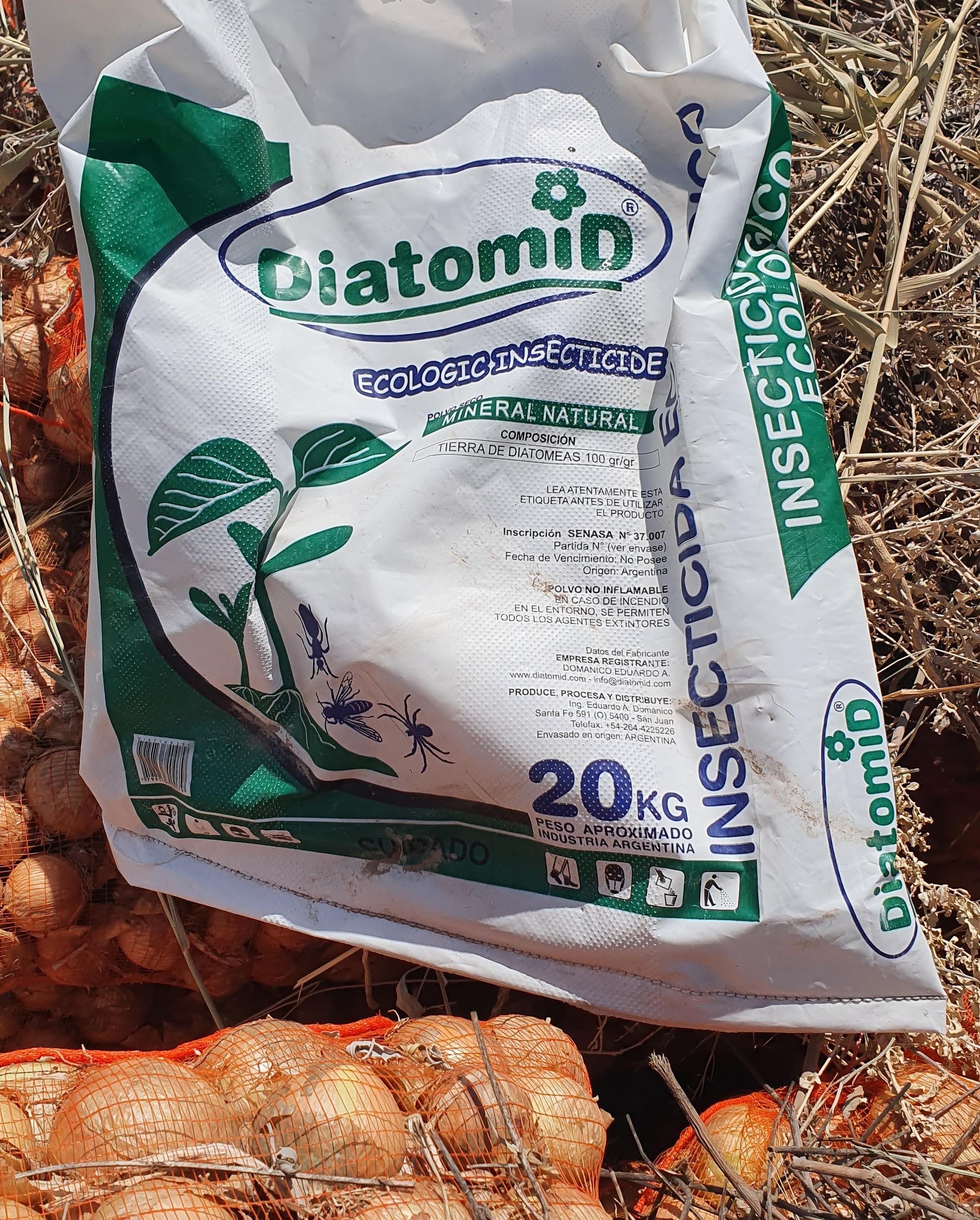 Eduardo hijo, mencionó "Diatomid, que es nuestra marca comercial de tierras de diatomeas, se está llevando para secar bien los bulbos madres de las cebollas, que luego serán plantaciones para semillas. Al provocar una lenta deshidratación, van secando de a poco y anulan los agentes patógenos dañinos. Se espolvorea directamente como fina capa por sobre las bolsas o cajones donde están estas hortalizas".