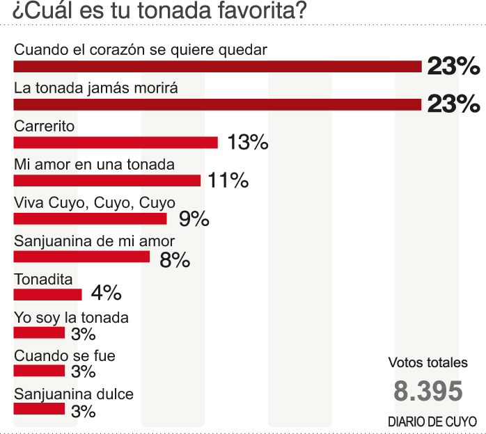 Como todos los 30 de noviembre, mañana se celebrará el Día de la Tonada Sanjuanina, el estilo musical que representa el acervo cultural y folclórico de la provincia y se caracteriza por no ser danzado. En el marco de la fecha instaurada por la Cámara de Diputados en 1998, en homenaje al natalicio de Ernesto Andrés Villavicencio, en un sondeo publicado en la web de DIARIO DE CUYO, los lectores escogieron sus favoritas. Así, en el podio, se ubicaron: Cuando el corazón se quiere quedar y La tonada jamás morirá, con el 23% de los votos; Carrerito, con el 13%; y Mi amor en una tonada, con el 11%.
