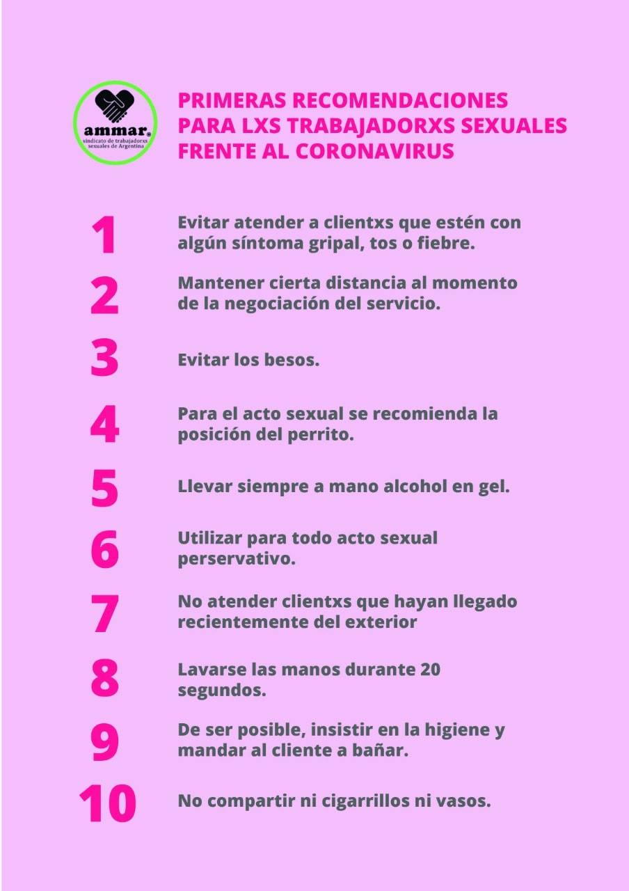 La Asociación de Mujeres Meretrices de la Argentina (ANMAR) difundió una serie de recomendaciones para las trabajadoras sexuales.