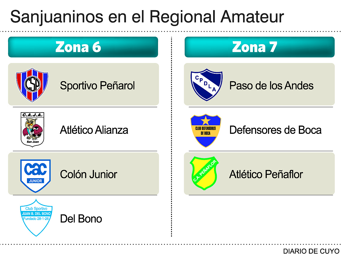 Luego de la renuncia masiva de los equipos de San Juan que en principio iban a ser parte del Torneo Regional Amateur, el nuevo certamen que organiza el Consejo Federal de AFA en reemplazo de los desaparecidos Federales B y C, se conoció la distribución final en la Etapa Clasificatoria de los siete conjuntos que llevarán la bandera sanjuanina en este campeonato que comenzará el 27 de enero próximo. Sabiendo que habrá como premio 4 ascensos para dividir en 8 zonas que son las que conforman el formato del Regional Amateur, los clubes de San Juan están incluidos en la Región Cuyo, dentro de las Zonas 6 y 7.