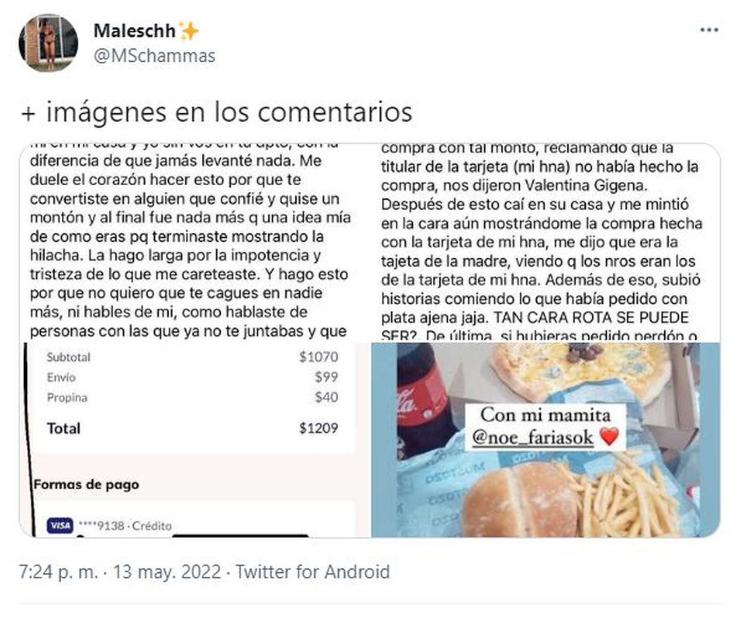 “Me mintió en la cara. Me dijo que era la tarjeta de la madre. Además de eso, subió historias mostrando lo que había comido con plata ajena”, expresó Male. “Esto va más allá de la plata”, aclaró en su mensaje. “Sino por lo que fuiste capaz de hacer y de hasta dónde podrías haber llegado”, le reprochó entre un extenso descargo.