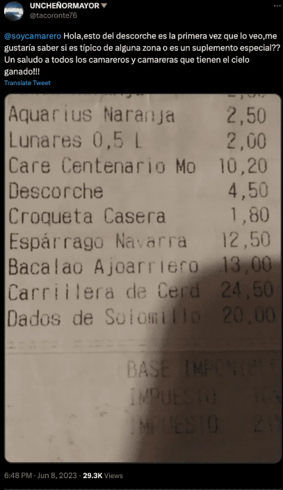 "Esto del descorche es la primera vez que lo veo. Me gustaría saber si es típico de alguna zona, o es un suplemento especial", escribió, y luego le tiró "buena onda" a los que trabajan en este rubro: "Un saludo a todos los camareros y camareras, que tienen el cielo ganado".