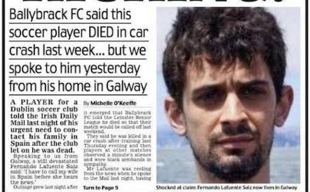 Una insólita situación se vivió en la Leinster Senior League (LSL), una liga amateur de Irlanda, cuando el Ballybrack FC tuvo que salir a pedir disculpas por dar por muerto a uno de sus jugadores, Fernando Nuno La-Fuente, cuando en realidad estaba vivo.