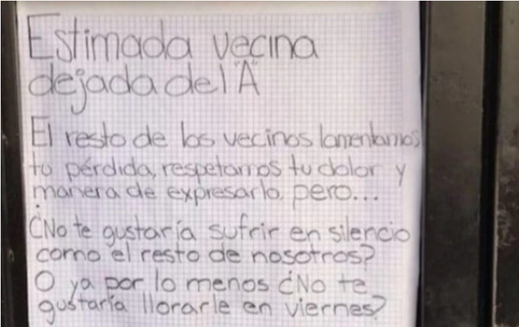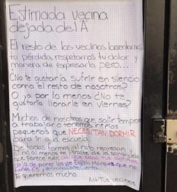 "Estimada vecina dejada del A. El resto de los vecinos lamentamos tu pérdida, respetamos tu dolor y manera de expresarlo pero…¿no te gustaría sufrir en silencio como el resto de nosotros? o ya por lo menos ¿no te gustaría llorarle en viernes? Muchos de nosotros tenemos que salir temprano a trabajar o tenemos niños pequeños que necesitan dormir para ir a la escuela", escribió en una parte del cartel.