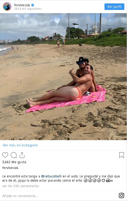 En una publicación en su cuenta de Instagram, Vives mostró cómo su marido luce la bombacha en una playa paradisíaca de Brasil. Acompañada de imagen, la mujer del delantero escribió: "Le encontré esta tanga a @sebacobelli en el auto. Le pregunté y me dijo que era de él. La debe estar pasando como el o…".