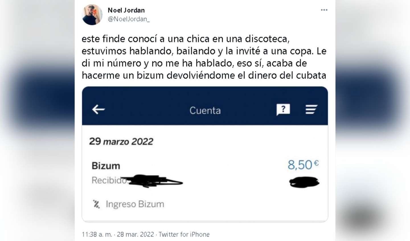 “Este finde conocí a una chica en una discoteca, estuvimos hablando, bailando y la invité a una copa. Le di mi número y no me ha hablado, eso sí, acaba de hacerme un Bizum devolviéndome el dinero del cuba libre que le invité”, escribió, junto con una screenshot del ingreso de 8,50 euros en la aplicación.