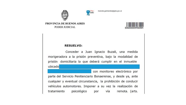 El juzgado de Garantías N° 5 de La Plata, a cargo de la jueza Marcela Garmendia, ordenó la prisión domiciliaria para Buzali, quien actualmente se encuentra detenido en una alcaidía en Olmos. Además, la magistrada dispuso la prohibición para que maneje automóviles y decidió que realice un tratamiento psicológico de manera virtual.